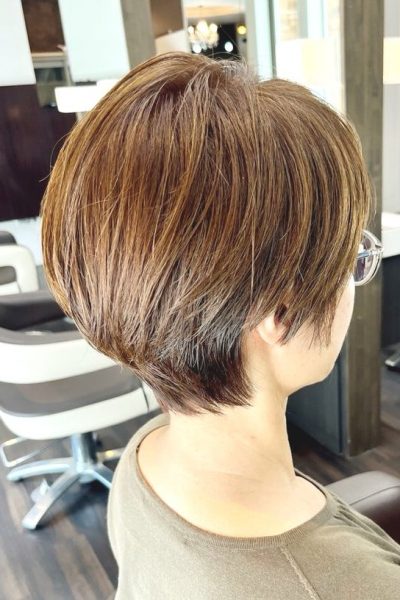 白髪ぼかしカラーをされています 髪全体を明るい髪色にすることで白髪が目立たなくなります ヘアスタイルもくびれショートでかわいいです 大門恵美