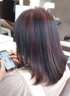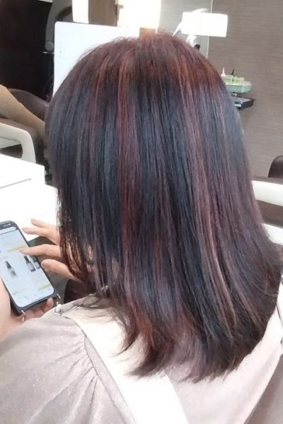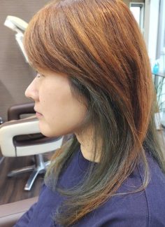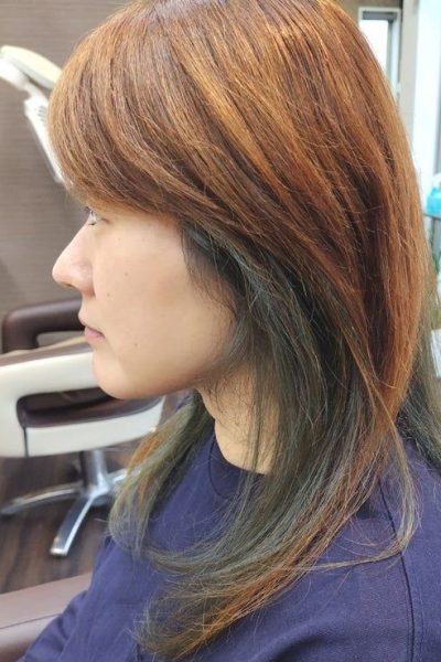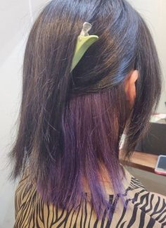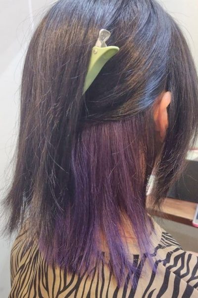 内側部分の髪を一度ブリーチをしてから パープルカラーにされました 髪を下ろすとさりげなく、 しばるとより色味が見えて楽しめるデザインです 大門恵美