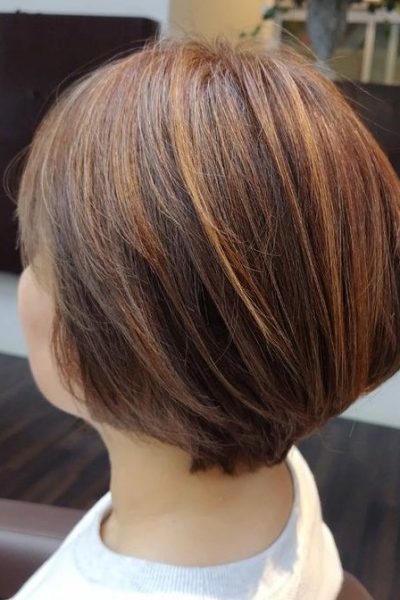 ハイライトとローライトをいれて立体的なカラーリングにされました 白髪ぼかしをしているので根元が伸びてきても めだちにくくデザイン性も高いスタイルです 大門恵美